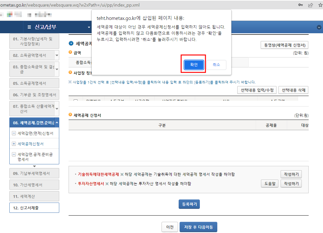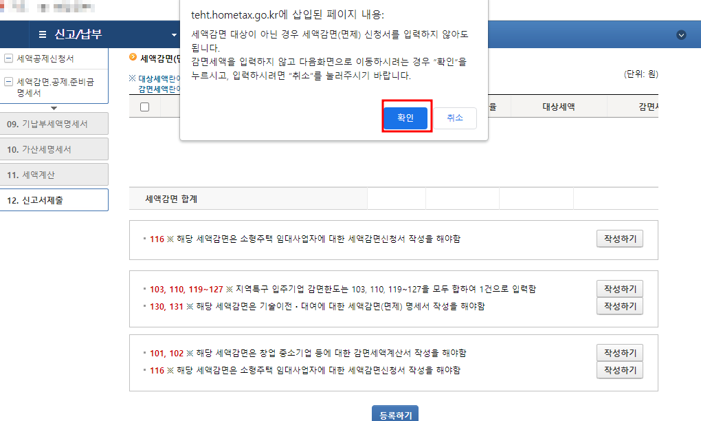 세액감면은 대부분 없어요. 확인 누르고 넘어갑시다.