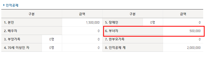 저희는 회사 연말정산에서 부녀자 공제가 빠졌거든요? (부녀자 500,000원이 0원으로 되어있음)