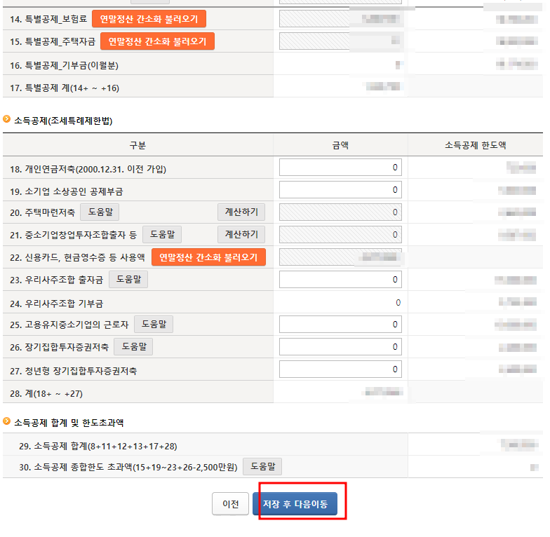 여기도 연말정산 간소화 불러오기 버튼을 한번 씩 눌러서 적용해주시고요. 저장 후 다음이동 버튼을 눌러줍니다.