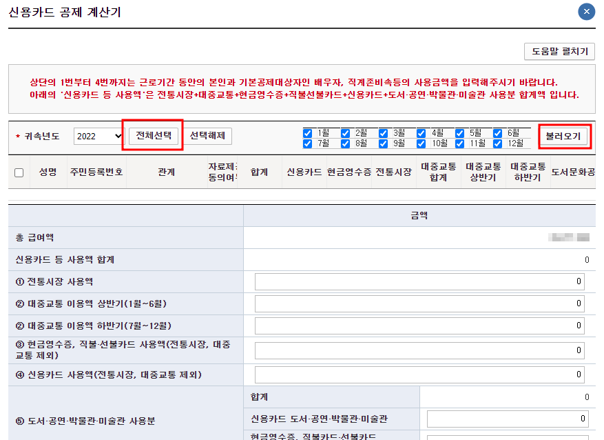 저는 신용카드 쪽이 빠져서 다시 했어요. 회사에 다닌 기간이 1~12월이면 저처럼 전체선택을 해서 불러오면 되고요. 혹시 중간에 실직기간이 있다면 그 개월 수는 빼주면 됩니다.