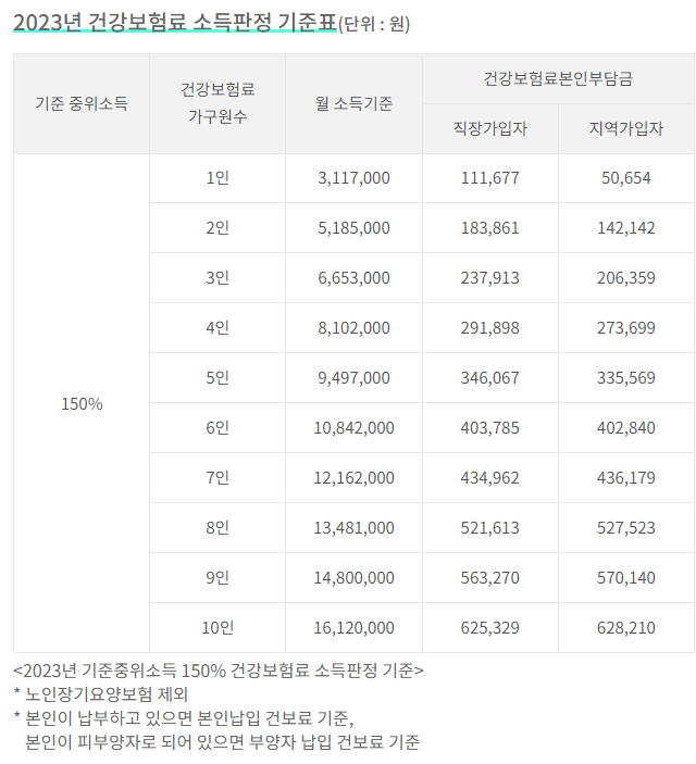 소득요건: 중위소득 150% 이하(건강보험료 기준)